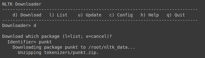 nltk.download()Using the command d we can select the download command then enter the identifier for the dataset, in our case we entered punkt.