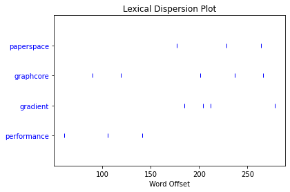 dispersion_plot(nltk_text,words,ignore_case=True)This resulted in the following dispersion plot