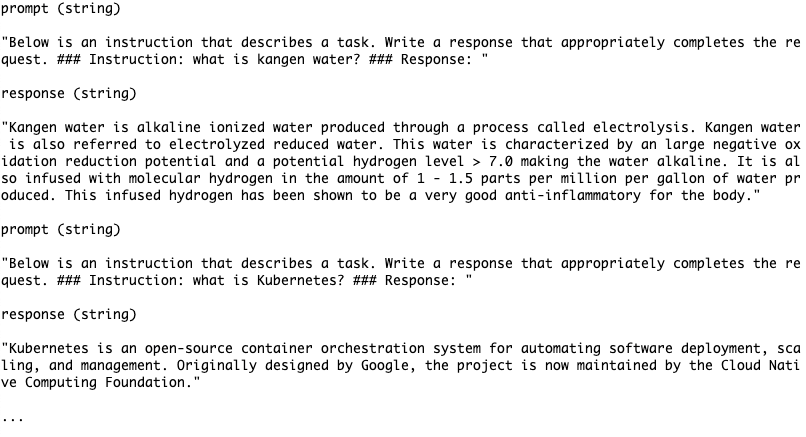 What we did do was generate output to prompts and qualitatively compare them to the responses of the base MPT-7B to the same prompts - see below. While this doesn't provide a quantitative evaluation, it does provide the vital sanity checks of whether the outputs are useful, and whether the ones from the fine-tuned model are obviously better than the base model.