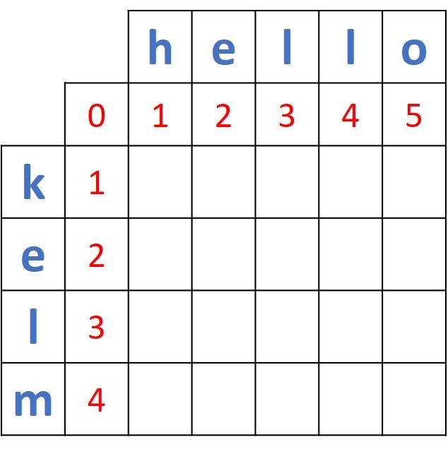 In this section we are going to prepare the distance matrix that will be used to calculate the distance between the 2 words kelm and hello using the dynamic programming approach. The next section will go through the steps of filling such a matrix.