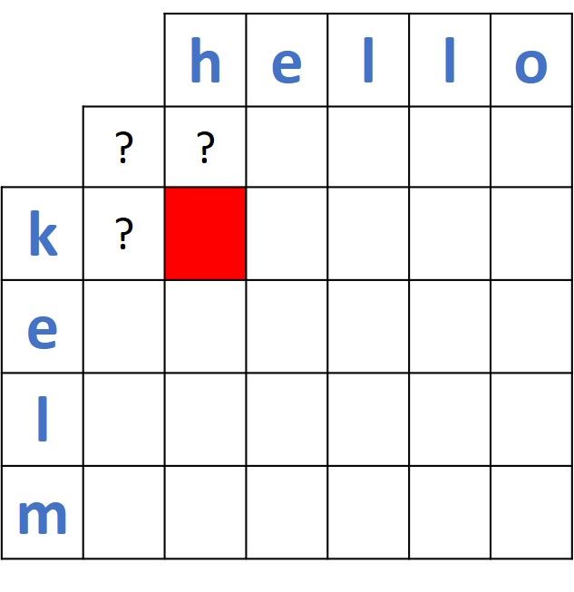Back to our question which is why we add the additional row and column in the distance matrix. Assume that the distance is to be calculated between the first 2 prefixes of the 2 words which are (k and h). According to the dynamic programming approach explained above, there must be three known values and just one missing value (marked in red in the next figure). By comparing the 3 existing values, the forth value will be calculated.