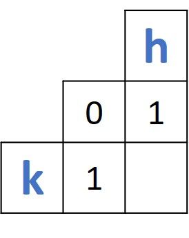 The first distance to be calculated is between the first two prefixes of the two words, which are k and h. The 2 x 2 matrix involved in this operation is given in the next figure. Because the two prefixes are different, the distance between them is calculated as the minimum of the 3 existing values (0, 1, and 1) + 1. So, the distance is min(0, 1, 1) + 1 = 0 + 1 = 1.