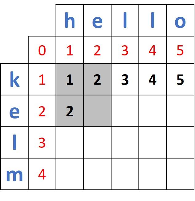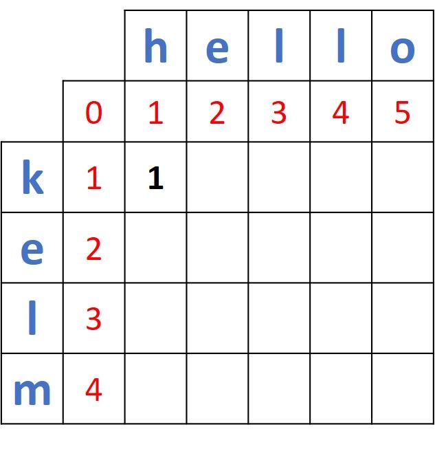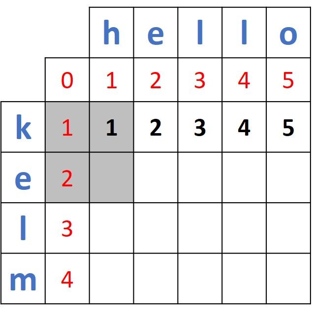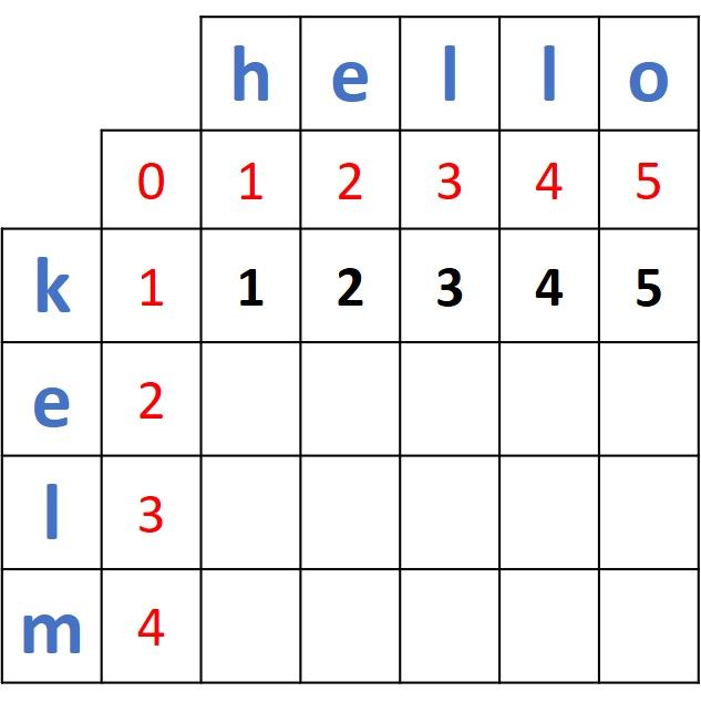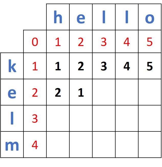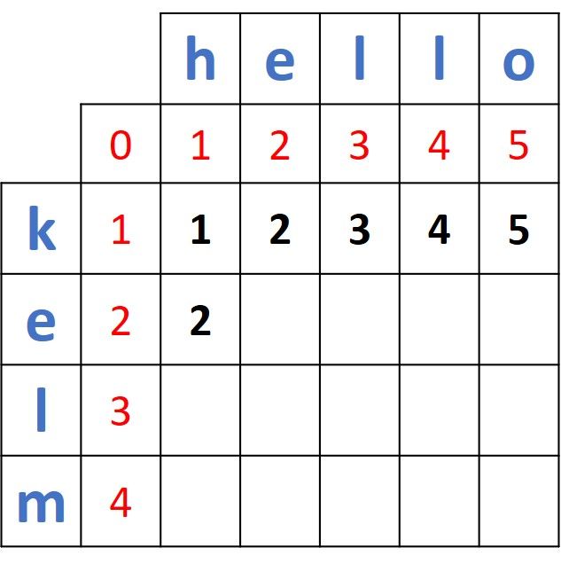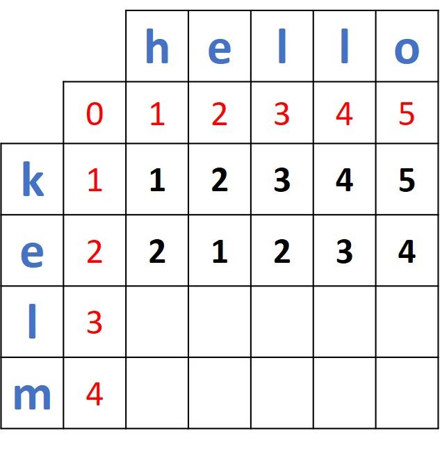 Note that the first distance is 1 just because the first two characters in the first two prefixes ("k" and "h") do not match. If the two words were helo and hello, then the first 2 prefixes (h and h) match and thus the first distance will be 0. Thus, the distances between the first prefix of helo (h) and the 5 prefixes in hello will be 0, 1, 2, 3, and 4.