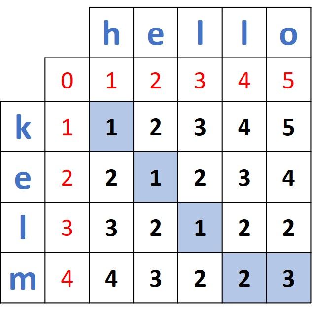 Continuing in this way, the complete distance matrix is shown below. The distance between the two full words kelm and hello is located at the bottom-right corner and the path of distances is marked in blue. The bottom-right cell has a value 3 which means 3 edits are required to transform kelm into hello. The 3 edits are: