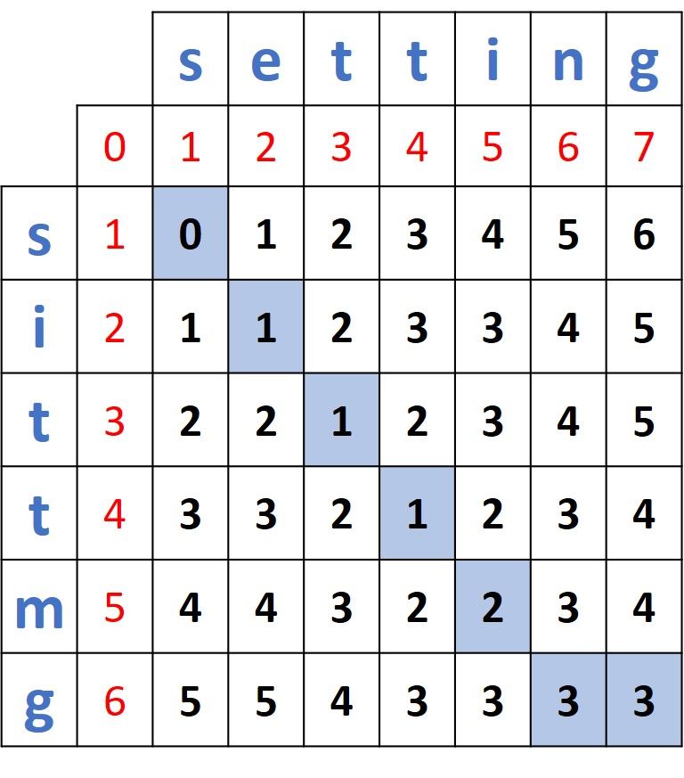 Without showing the steps, here is another distance matrix for measuring the distance between the words sittmg and setting.