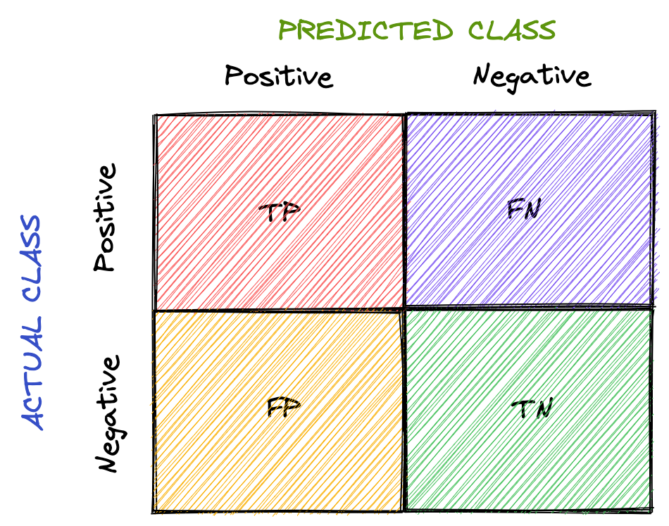 - False Negatives (FN): Prediction doesn’t belong to a class, but observation belongs to a class