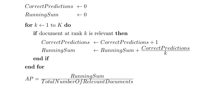 \[ AP = \frac{\sum_{i=1}^{k} P(k) * rel(k)}{number\, of\, relevant\, documents} \]