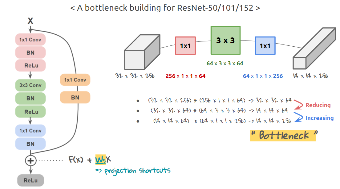 As shown above, in a Residual Block the input first undergoes a $(1 \times 1)$ pointwise convolution operator (note: pointwise convolution doesn't affect the spatial dimensions of the input tensor, but is used to manipulate the number of channels in the tensor). This is followed by a channel-preserving spatial $(3 \times 3)$ convolution which essentially reduces the spatial dimensions of the feature maps in the input tensor. Finally, this is followed by another pointwise $(1 \times 1)$ convolution layer which increases the number of channels to the same number as that of the input to the main branch.