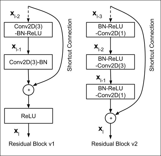 ResNet proposed an underlying fundamentally portable structure called the Residual Block. There are two variants of the Residual Block, as shown in the above diagram; Residual Block v1 and Residual Block v2. Residual Block v1 is predominately used for the smaller ResNet models evaluated on CIFAR datasets, while the Residual Block v2 is the more discussed block structure used for ImageNet-based models. From now on, when we mention the Residual block, we will be referring to the Residual Block v2 to keep the discussion relevant to ImageNet-based models.