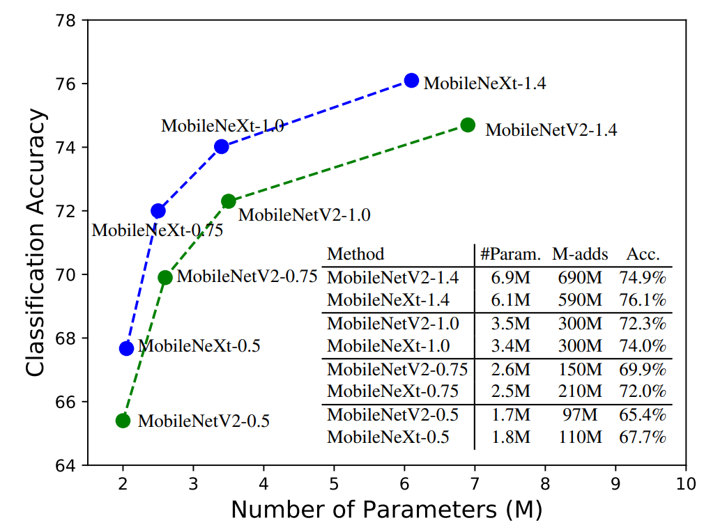 As shown in the graph above, MobileNeXt seems to perform better than MobileNet in every regard. It is lighter in terms of parameters, and still obtains a higher accuracy than its equivalent MobileNetV2 counterpart. In the subsequent tables, we will show how MobileNeXt performs across different tasks, like image classification on the ImageNet dataset and object detection on the Pascal VOC dataset.