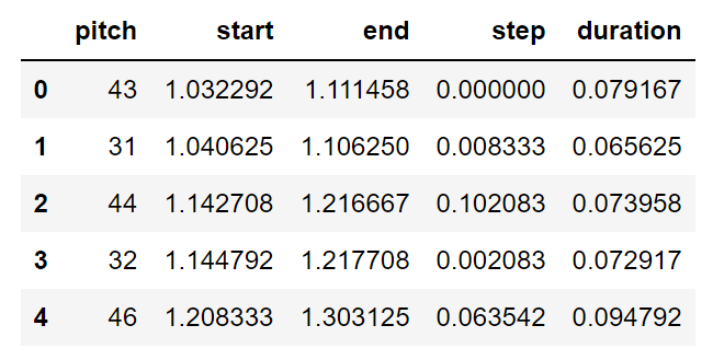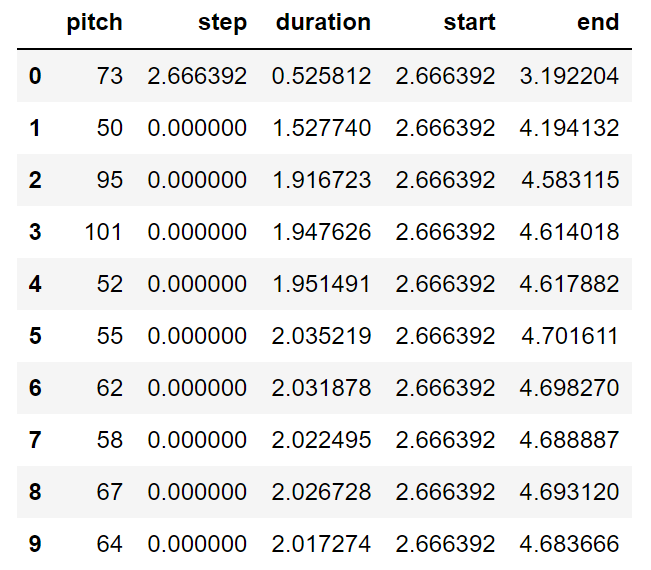 The pitch values above represent the perceptual quality of sound as recognized by the MIDI note numbers. The step variable represents the time elapsed from the previous note or start of the track. Finally, the duration variable represents the difference between the start time and end time of a note, i.e., how long a particular note lasts. In the code snippet below, we extract these three parameters that will be utilized for constructing the LSTM model network to compute and generate music.
