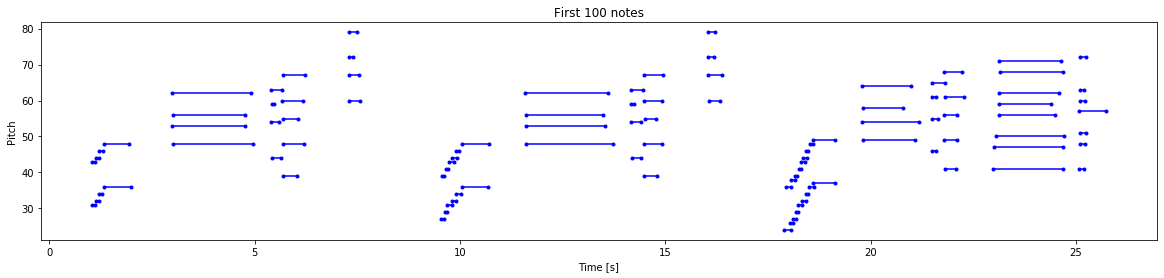 Finally, let us convert the files to vector values by using numpy arrays. We will assign numeric pitch values to note names as they are easier to interpret. The note names shown below represent the features such as note, accidental and octave number. We can also visualize our data and interpret them accordingly. Below are two visualizations: a.) Visualization of first 100 notes and b.) Visualizing the entire track.