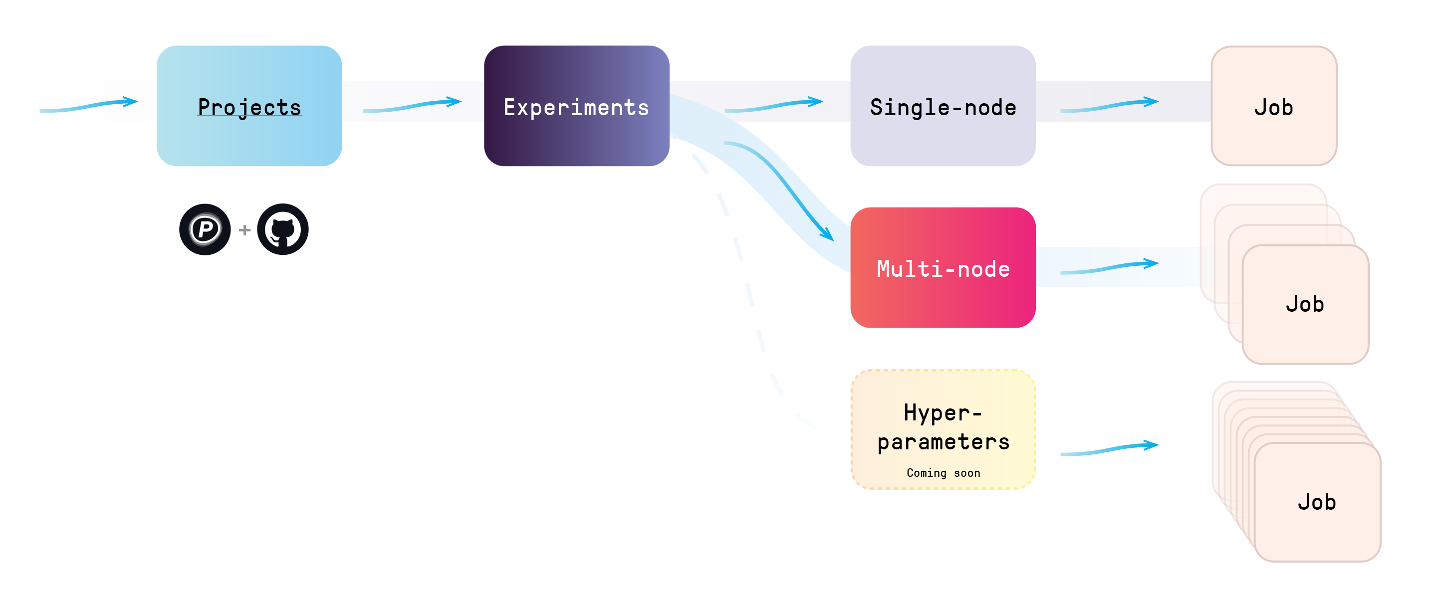You can run any number of Experiments within each Project. And Experiments can take many forms, including the new possibility of running many different containers working in tandem to produce a result. The first of these is native support for multinode training.