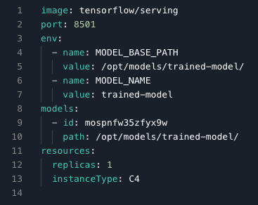 We are using the latest TensorFlow TFServing Docker image tensorflow/serving, the REST API on port 8501 (gRPC is also available, typically on port 8500), the unique ID of the model, its location in the container, a single replica, and our C4 CPU instance type as the hardware.