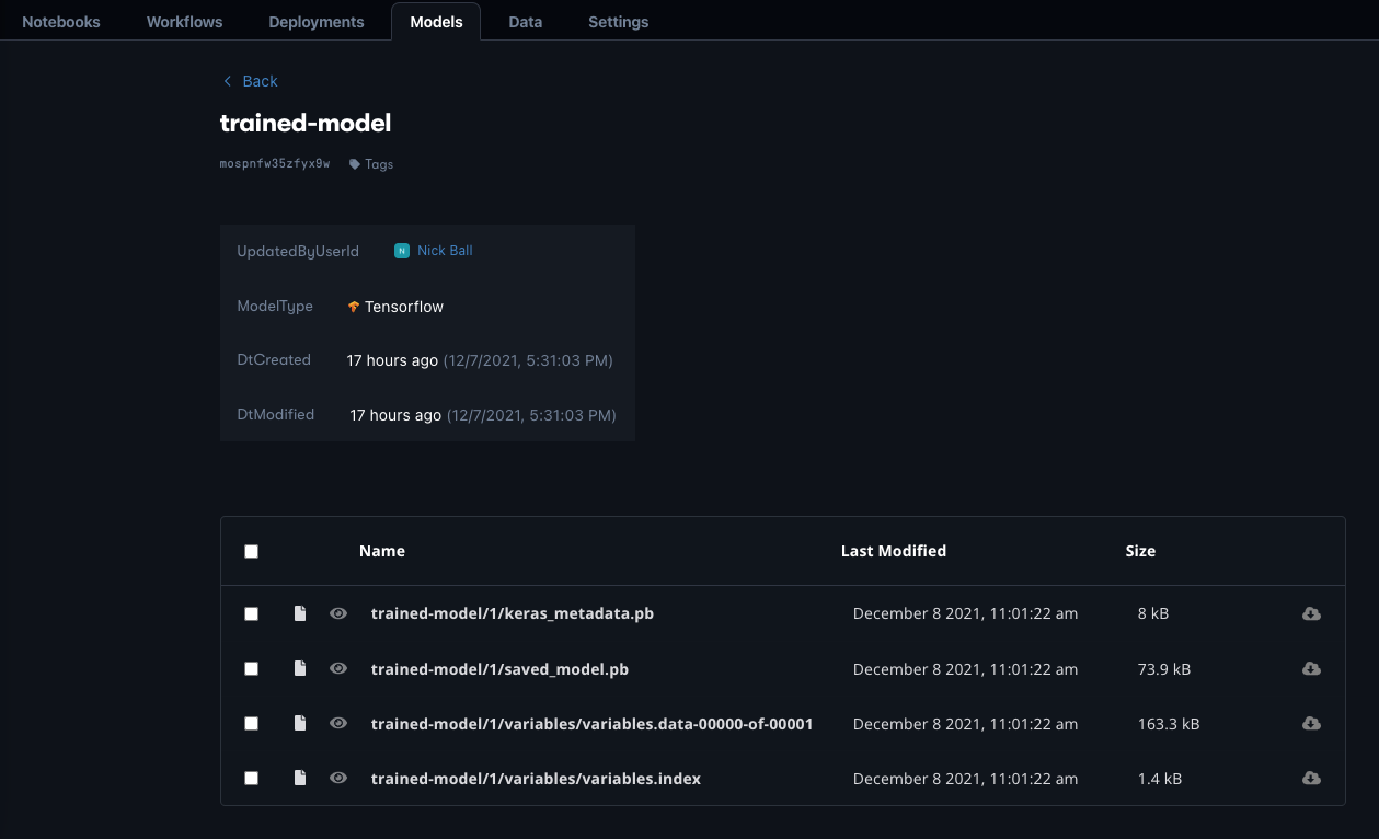 We can see the files within it, its version (1), its unique ID, and that Gradient recognizes it as a TensorFlow model. We can upload our own models to the Model Registry as well.