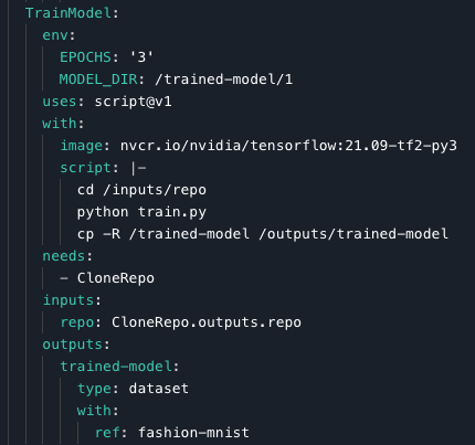 We can see that the model is trained for 3 epochs (the other hyperparameters are left on default), using the train.py script from our repository, then run on our TensorFlow container, and output to the Dataset trained-model.