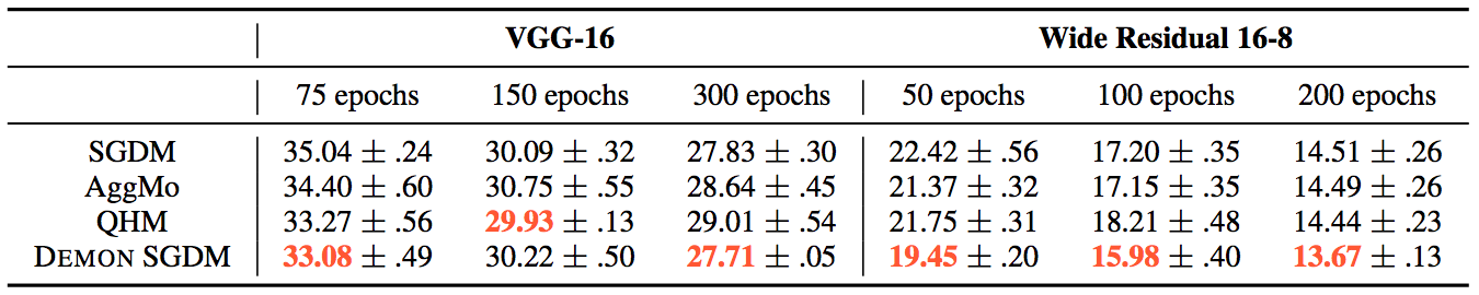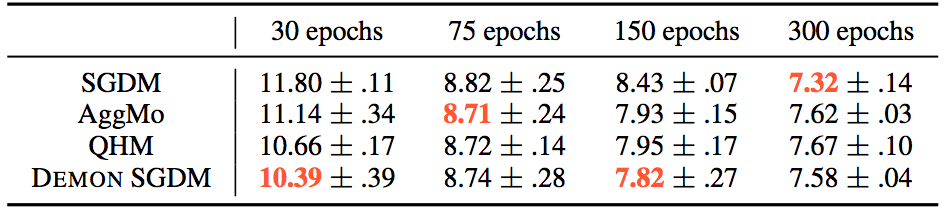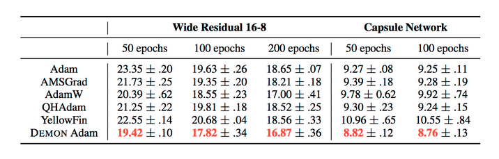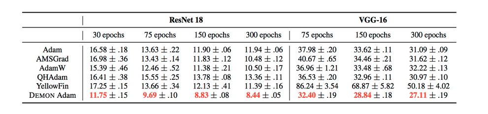 - Demon - Decaying Momentum is a momentum rule that can be applied to any gradient descent algorithm with momentum. The decaying momentum rule reduces the velocity value by decaying the "energy" that a gradient transfers to the future time step by weighting it with the ratio of current time step to the final time step. There is usually no hyperparameter tuning required because the momentum usually decays to 0 towards the final optimization iterations. The algorithm performs better when the decaying is delayed.