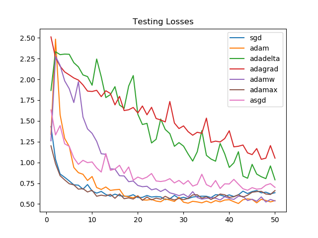 Looking at the graphs, it is clear that for the task we chose, Adagrad and Adadelta improve linearly and aren't able to perform as well as Adammax, SGD, Adam, or AdamW.