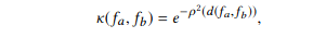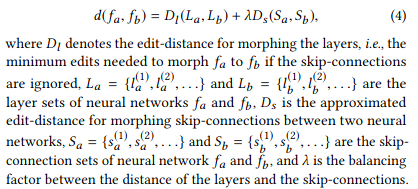 where d denotes the edit distance between architectures fa and fb, and p is the mapping function that maps the edit distance to the new space. This new space is based on embedding the original metric into a new one using the Bourgain theorem. The edit distance is approximated for this NP hard problem as follows.