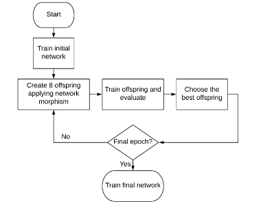 Kwasigroch et al. (2019) propose a network morphing approach for neural architecture search using evolutionary algorithms and the hill climbing algorithm for the problem of detecting malignant melanoma. The hill climbing strategy works by iteratively perturbing an initial solution to create new solutions until the best one is found. The hill climbing strategy applied to NAS with evolutionary algorithm-inspired morphing operations is visualized below.