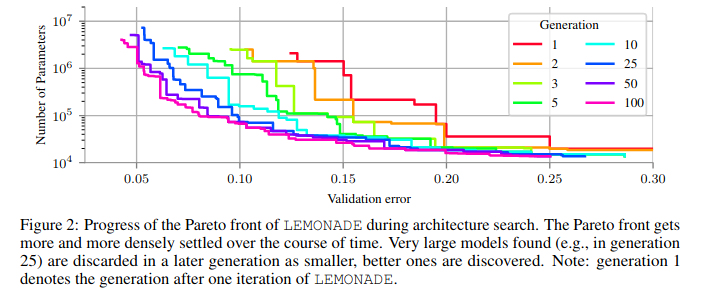 As pointed out by Elsken et al. (2018), an advantage of using evolutionary algorithms over other optimization methods is the flexibility they provide in the design of a performance function. The fitness functions can range from extremely simple to very complex, and give us a lot of room to experiment when compared to error rates or log-likelihood functions. Elsken et al. (2019) solve for scalability, high accuracy, and low resource consumption by proposing LEMONADE. This is an evolutionary algorithm for multi-objective architecture search that allows approximating the entire Pareto front of architectures under multiple objectives, such as predictive performance and number of parameters, in a single run of the method.