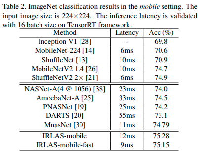 They apply Q Learning using a normalized version of the reward shown above to guide their search. IRLAS is able to achieve state of the art results on ImageNet, and in a mobile setting.