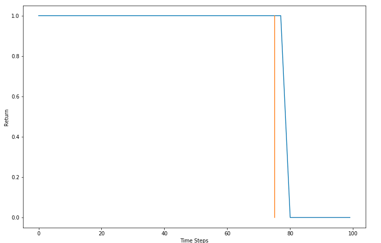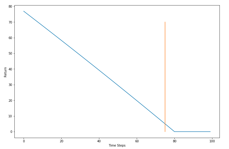 The orange line represents the 75 time-step mark. The vehicle should at least start to slow down here. In other words, the return should be less so such behaviors (speed on a collision path) are discouraged. The return starts to fall only after the 78th time step when it's too late to stop. The return for speeding at the 75th time step should be less too.