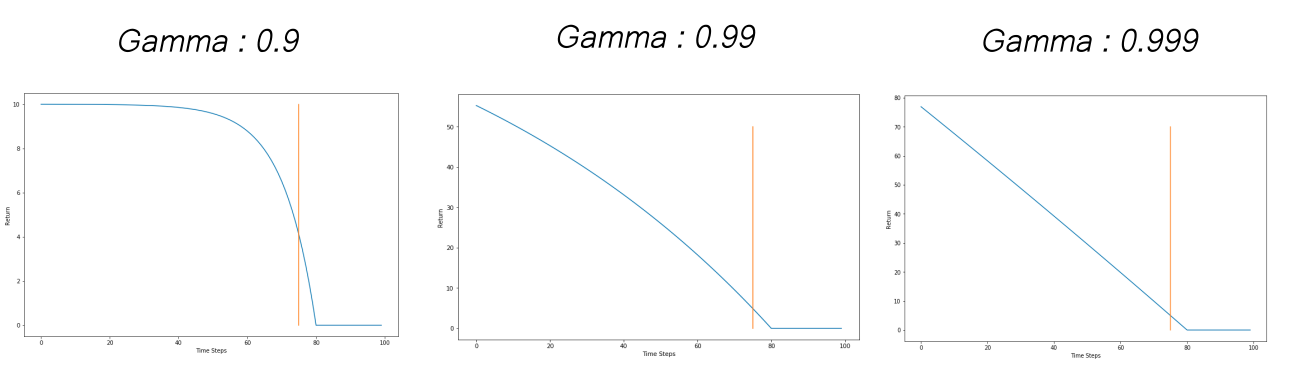 The parameter $ \gamma $ lets us control how far we are looking into the future when it comes to using rewards to compute our return. A higher value of $ \gamma $ will have us look further into the future. The value of $ \gamma $ is between 0 and 1. The weightage of the rewards fall exponentially with each time step. Popular values used in practice are 0.9, 0.99 and 0.999. The following graph shows how $ \gamma $ effects the return for our car example.