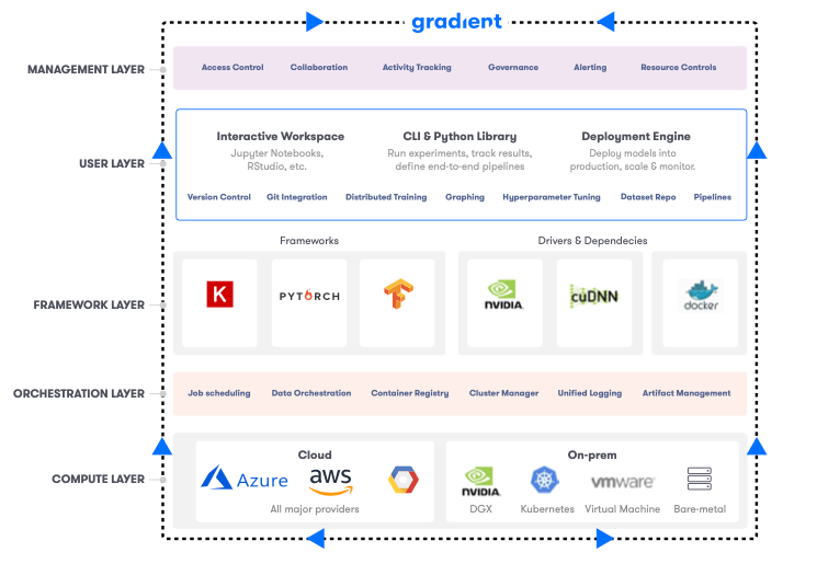 The cloud-native approach has meant that Gradient supports GCP, AWS, and Azure with ease and we just launched an open-source installer for running Gradient on any other environment you can imagine — from your local computer to the cloud.