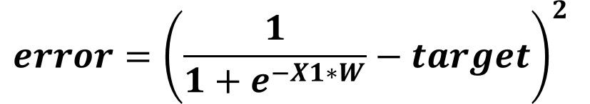 Do not forget that the predicted value is calculated as the output of the sigmoid function. Thus, we can substitute by the sigmoid function into the error equation and the result will be as given below. But up this point, the error and the weight are not included in this equation.