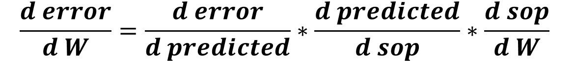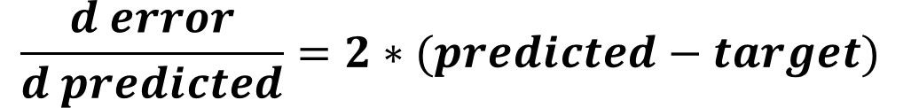 When the 2 participants of the gradient, which are the error and W in this example, are not related directly by a single equation, we can follow a chain of derivatives that starts from the error until reaching W. Looking back to the error function, we can find that the prediction is the link between the error and the weight. Thus, we can calculate the first derivative which is the derivative of the error to the predicted output as given below.