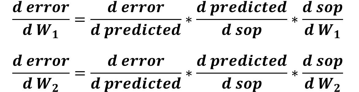 The derivative chain for the error to W1 and W2 are given in the next figure. What is the difference? The difference is how to calculate the last derivative between the SOP and the weight. The first 2 derivatives are identical for both W1 and W2.