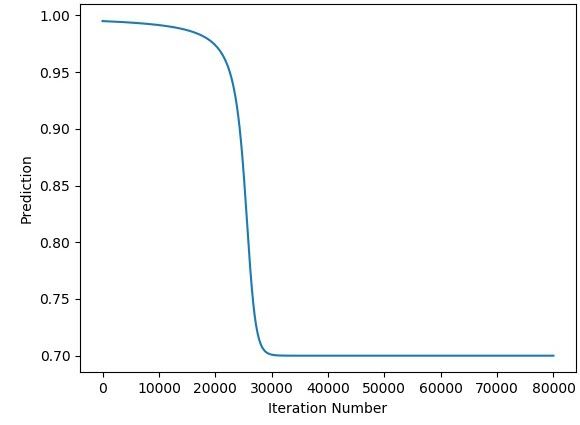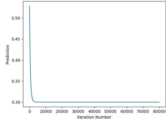 print(predicted)The figure below shows how the prediction of the ANN changes until reaching the desired output which is 0.3. After around 5,000 iterations, the network is able to do the correct prediction.