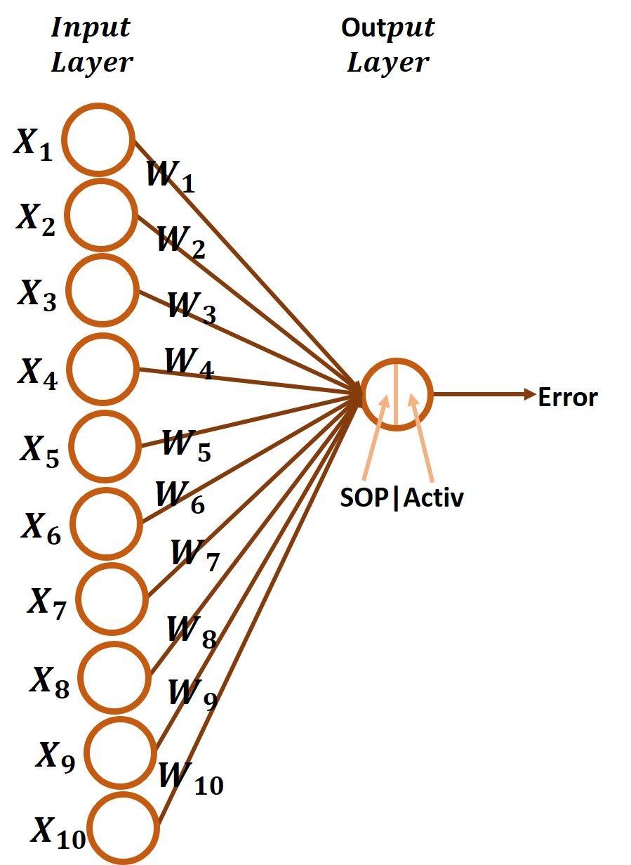 The network architecture with 10 inputs and 1 output is given below. There are 10 inputs X1 to X10 and 10 weights W1 to W10 and each input has its weight. Building the GD algorithm for training such a network is similar to the previous example but just using 10 inputs rather than 2. It is just a matter of repeating the lines of code that calculate the derivative between the SOP and each weight.