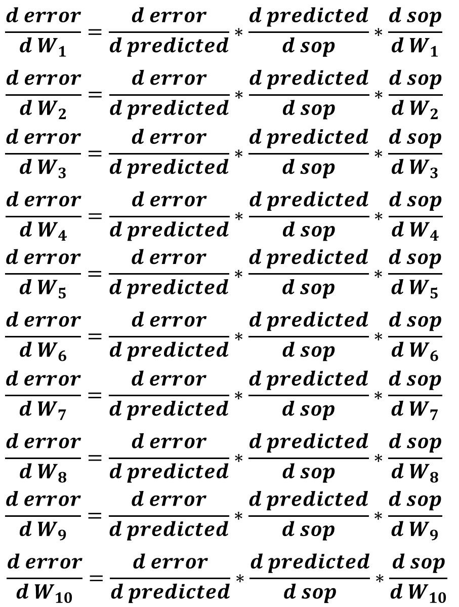 # y = w1*x1 + w2*x2 + w3*x3 + w4*x4 + w5*x5 + w6*x6 + w7*x7 + w8*x8 + w9*x9 + w10*x10