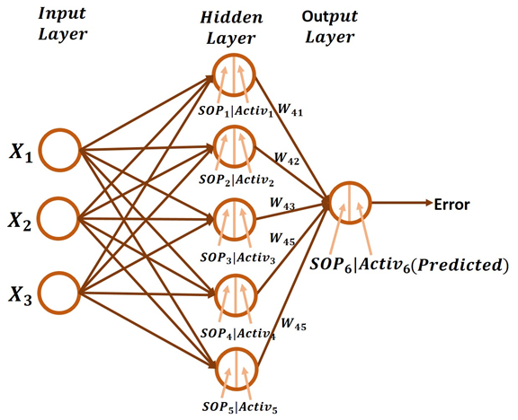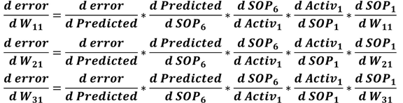 SOP1 = X1*W11 + X2*W21 + X3*W31If the weights connecting the input neurons to the second hidden neuron are W12, W22, and W32, then SOP2 is calculated as given below. As a result, the SOP2 to W12 derivative is X1, SOP2 to W22 derivative is X2, and so on. The process continues for all other hidden neurons.