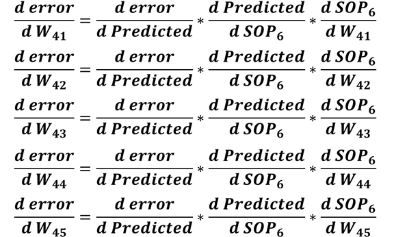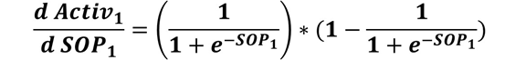 SOP6 = Activ1*W41 + Activ2*W42 + Activ3*W43 + Activ4*W44 + Activ5*W45For example, the derivative of SOP6 to W41 is equal to Activ1, the SOP6 to W42 derivative is equal to Activ2, and so on.