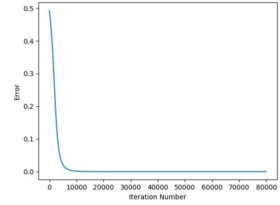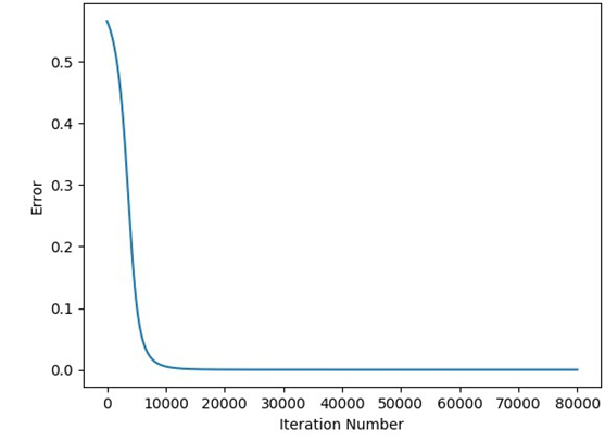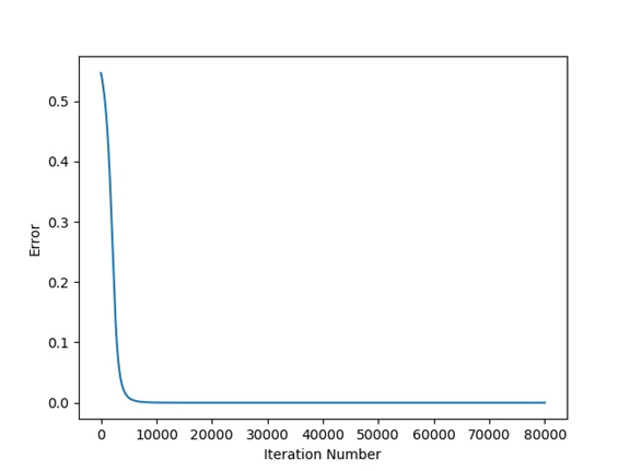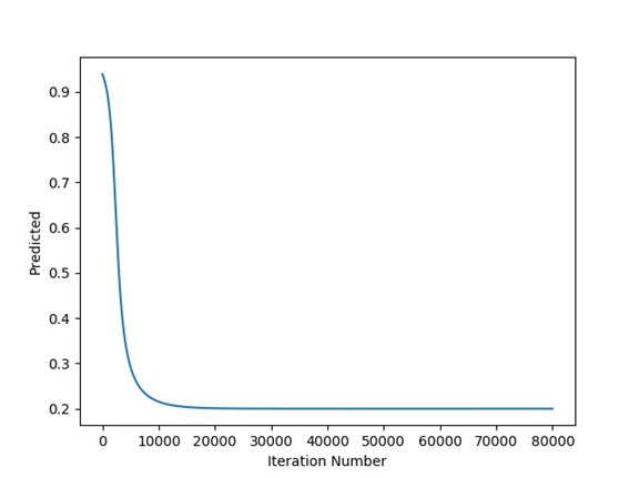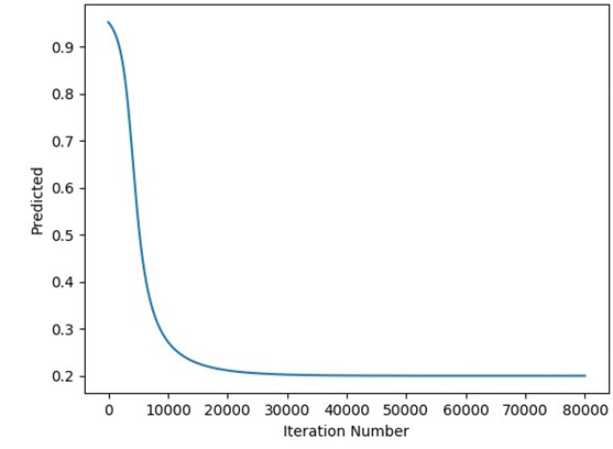 print(predicted)The next figure shows the relationship between the predicted output and the iteration number which proves that the GD algorithm is able to train the ANN successfully.