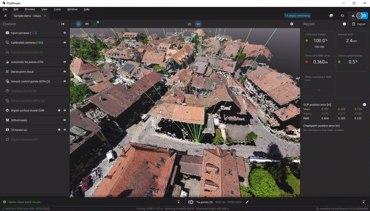 After processing, we can start looking around our newly created 3D representation of the urban area dataset. By doing so, we can get a better understanding of how this model was created. By clicking on each of the tie points, we can see how each of the "cameras" different angles together has a direct line of site to the points. Each of these different line of sights gives different information for Pix4D to use to create this 3D representation.