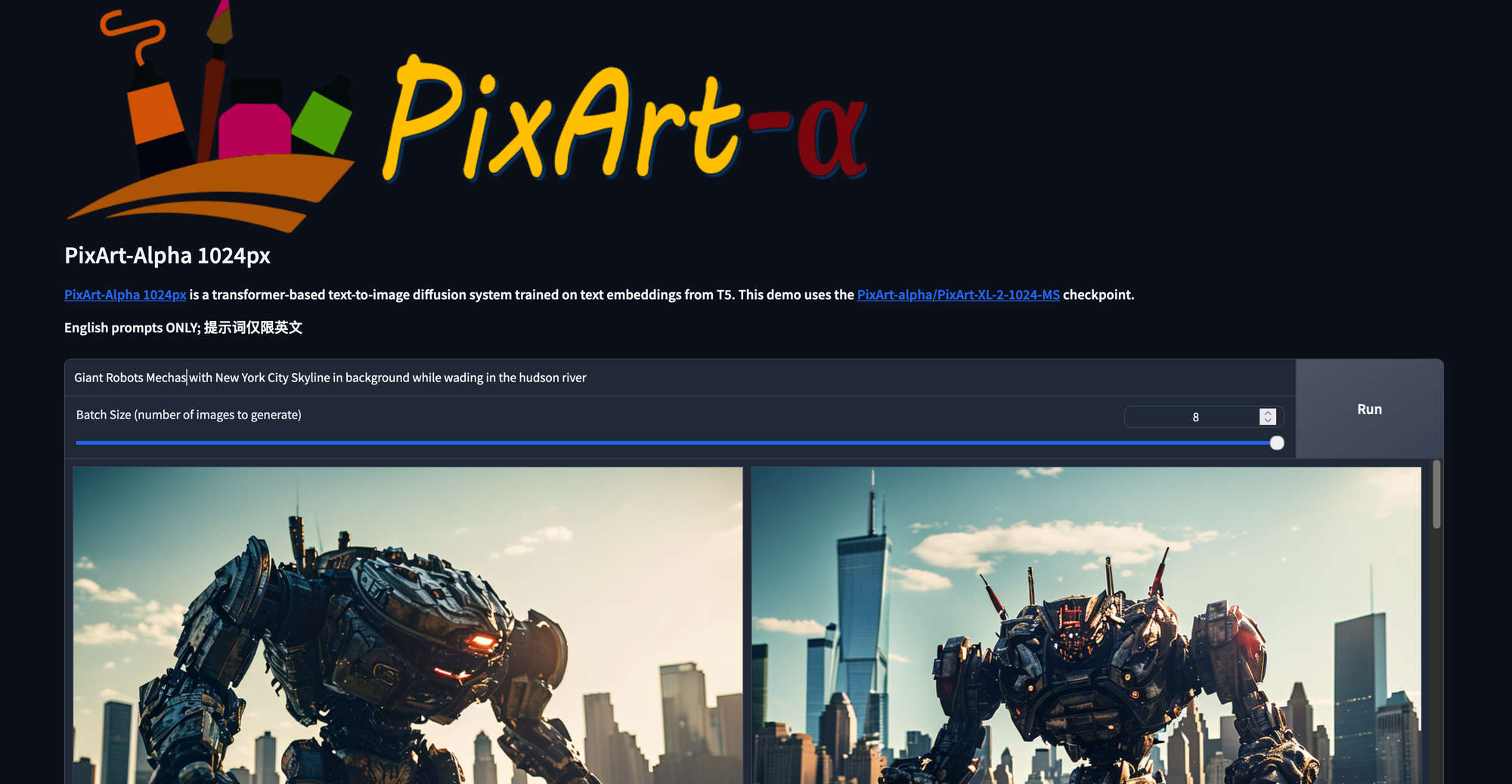 !python app.pyThis will launch our Gradio application, which has been modified slightly from the demo for PixArt Alpha readers may have seen on their Github or HuggingFace page. Let's take a look at what it can do, discuss the improvements we have added, and then take a look at some generated samples!
