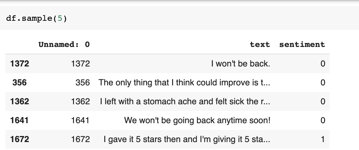 df = pd.read_csv('/tmp/sentiment.csv')Here is a sample of the data.