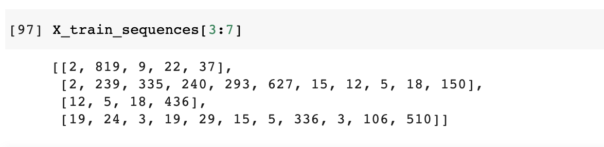 X_train_sequences = tokenizer.texts_to_sequences(X_train)Here is how these sequences look.