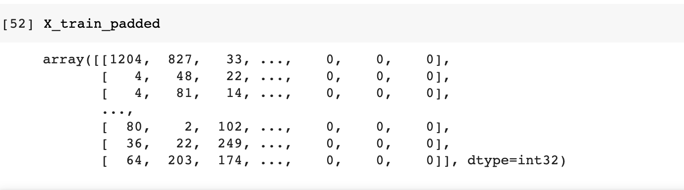 truncation_type='post'With those in place, let's start by padding the X_test_sequences. This is done using the pad_sequences function while passing the parameters defined above.