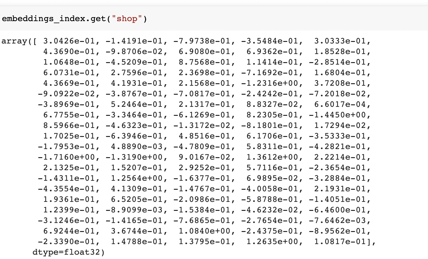 embedding_matrix[i] = embedding_vectorHere is what the word embedding for the word "shop" looks like.