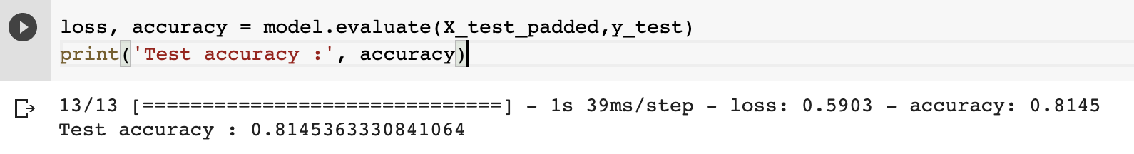 history = model.fit(X_train_padded, y_train, epochs=num_epochs, validation_data=(X_test_padded, y_test),callbacks=callbacks)You can use the evaluate method to quickly check the performance of the model.