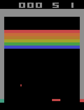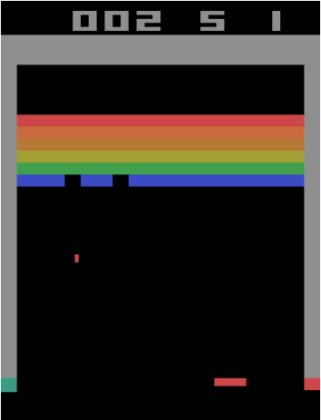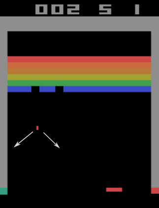 If we were modeling such a scenario in real life, the non-elastic nature of the collision would violate the Markov property of the state. However, if we could add more details to the state such as the coefficient of restitution (something that will allow us to factor the non-elastic nature of the collision into our calculation), the state becomes Markovian again because we can precisely predict the future position of the ball. Thankfully, in Breakout, collisions are purely elastic.