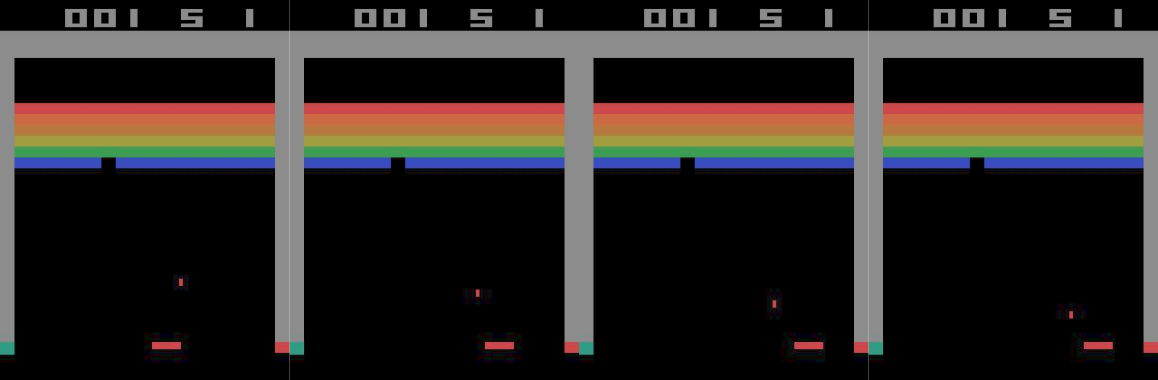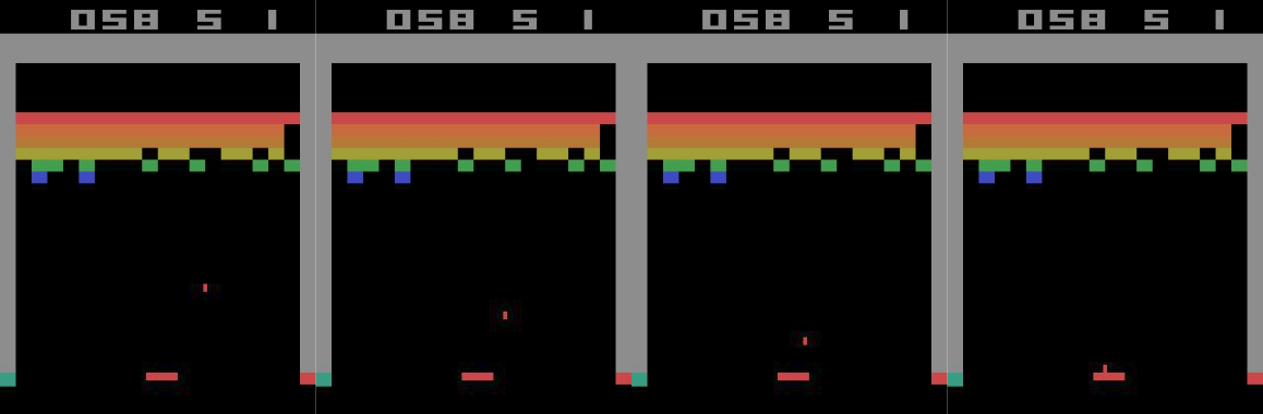 The ball could be going in either of the directions marked by the two white arrows, but we have no way to tell which. So maybe we need more information to make the state Markovian. How about we take the past 4 frames as our state, so that we have at least an idea of where the ball is heading?