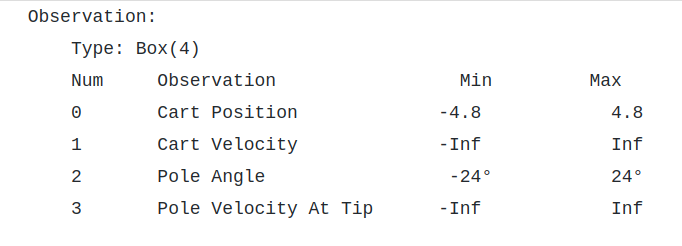 The state is made up of 4 intrinsic state variables: cart position, velocity, pole angle, and pole velocity at the tip. The following are legitimate values for the state variables.