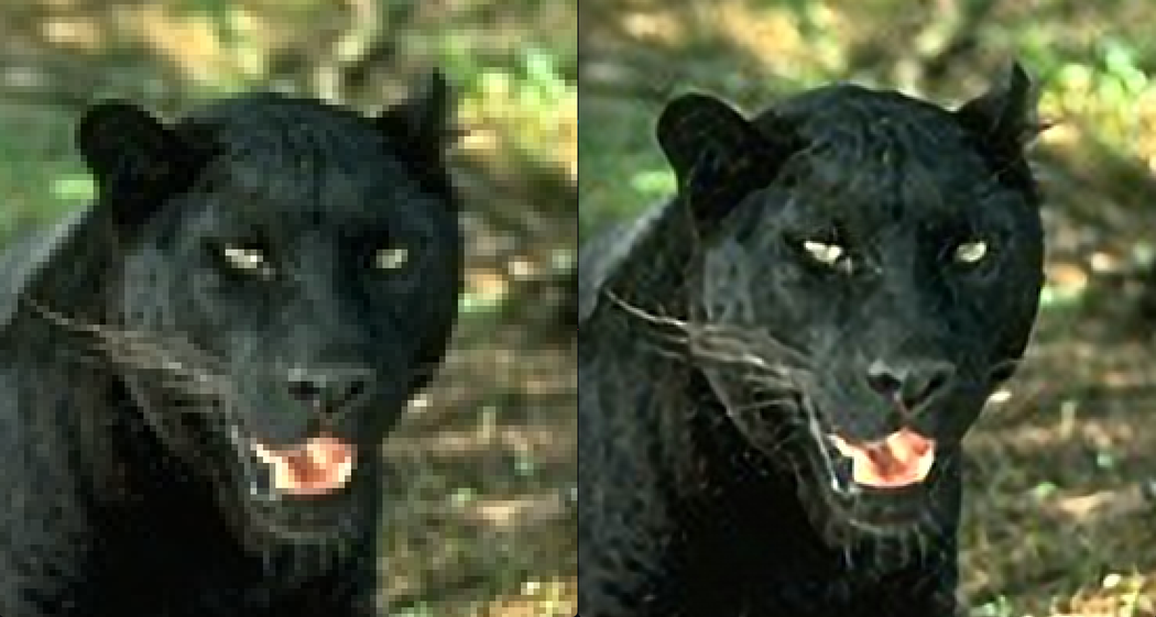 Super-resolution imaging (right) infers pixel values from a lower-resolution image (left).