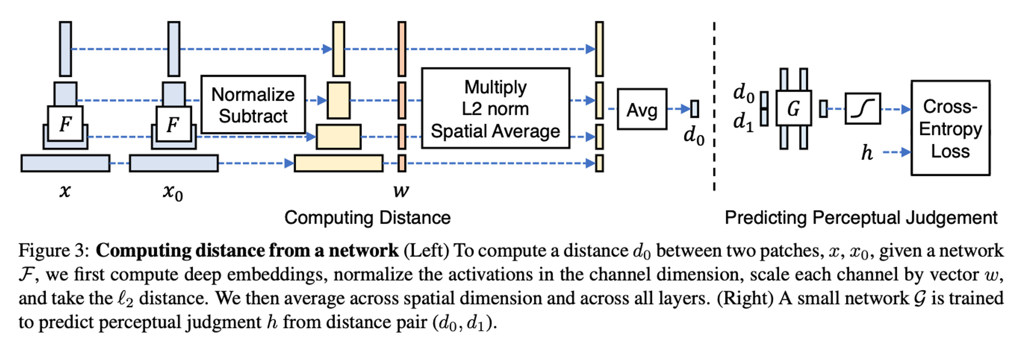 In order to use the deep features of a network to find the distance $d_o$ between a reference $x$ and 2 distorted patches $x_0, x_1$ given a network $F$ the authors employ the following steps:
